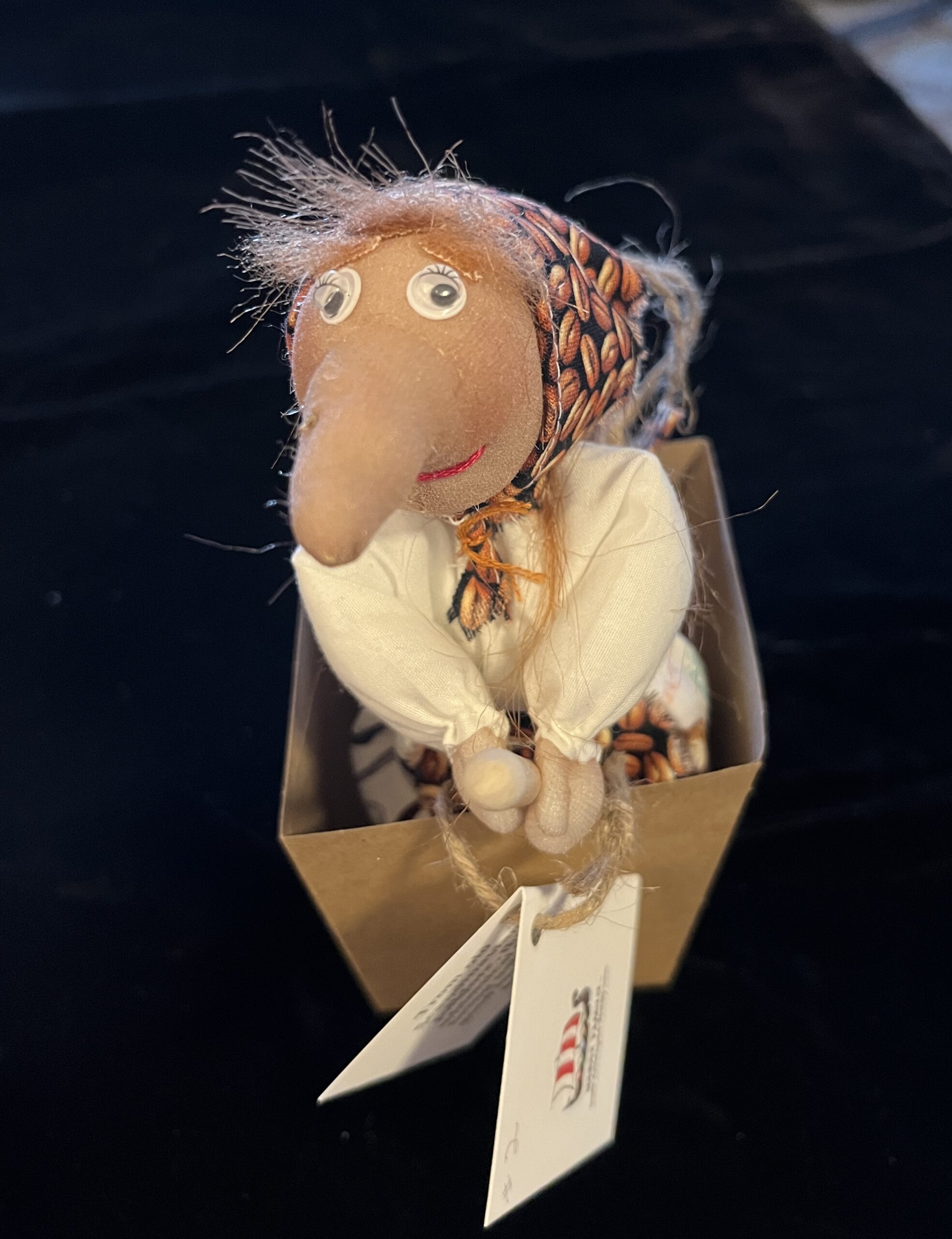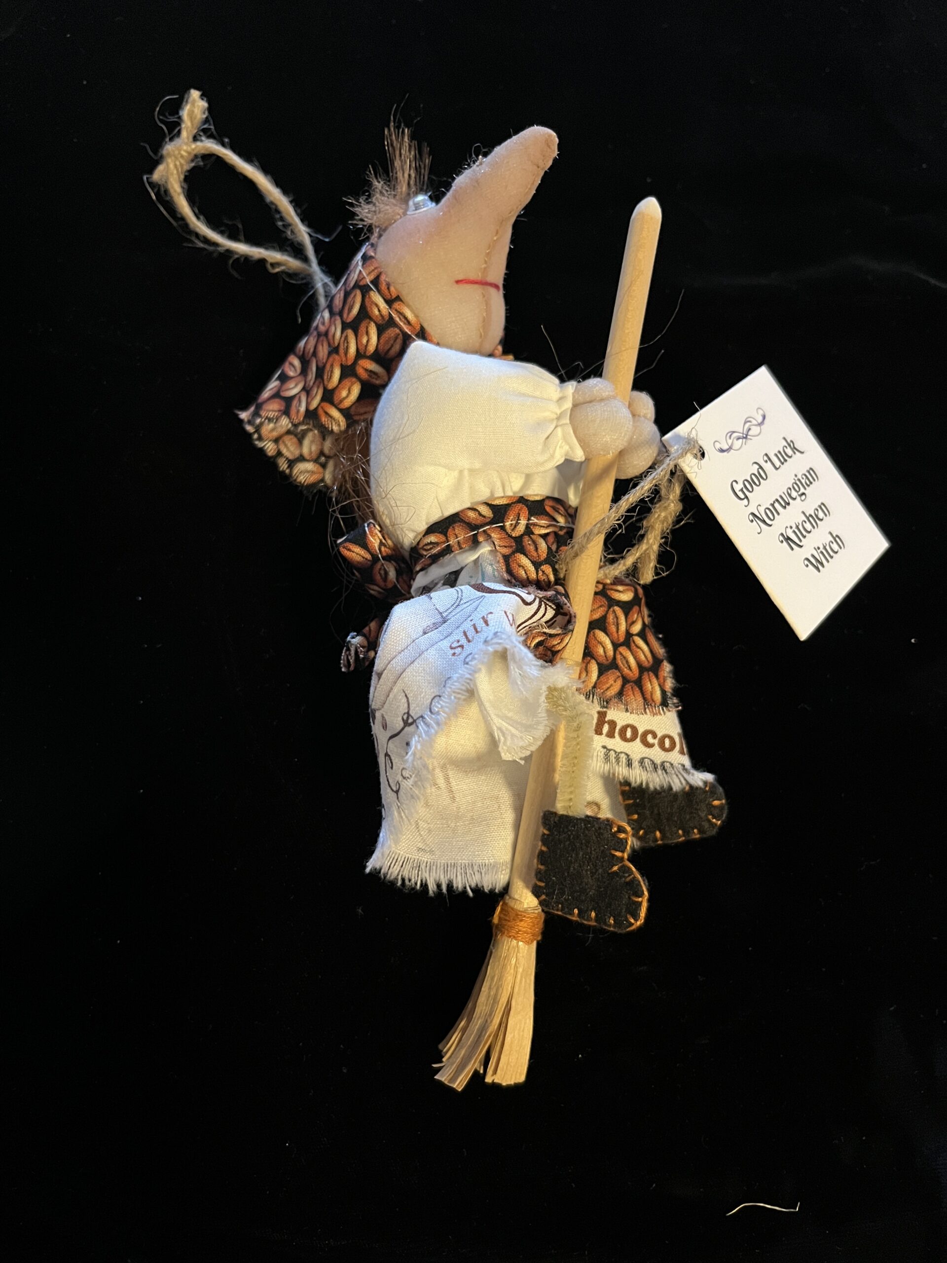 Our little whimsical creations are all handmade so each one is different. We have very little control over their noses. From tip of their nose to the end of the broomstick, their length is about 8″. A thin jute rope will allow her to be hung in your kitchen to watch over you.